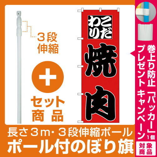 【プレゼント付】【セット商品】3m・3段伸縮のぼりポール(竿)付 のぼり旗 こだわり 焼肉 (H-166)